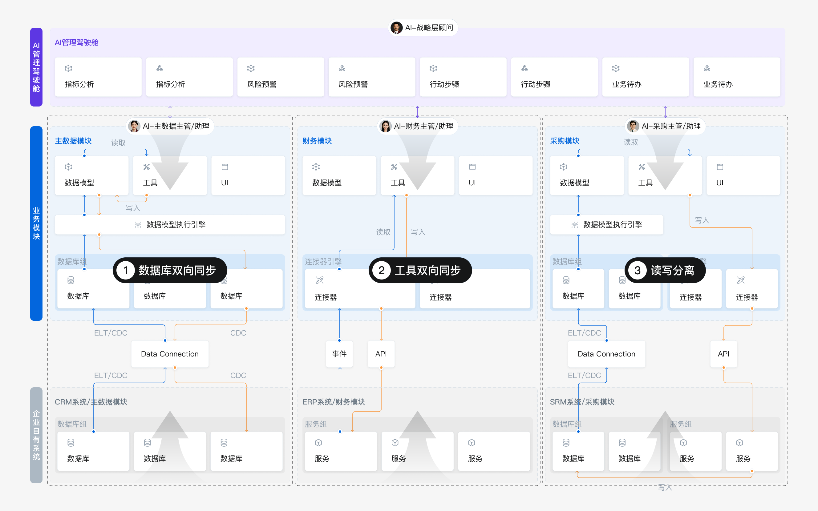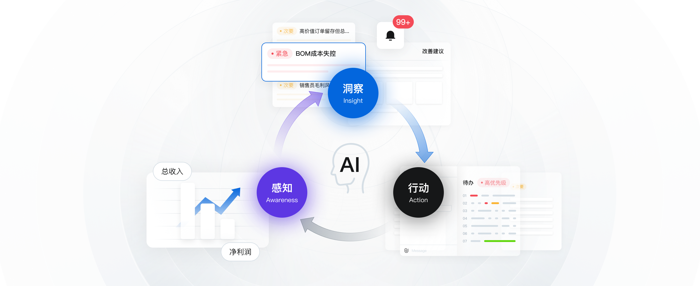 以管理逻辑为核心,构建企业级数智员工组织。 实现实时洞察 · 风险预警 · 行动建议 · 执行闭环的一站式驱动。